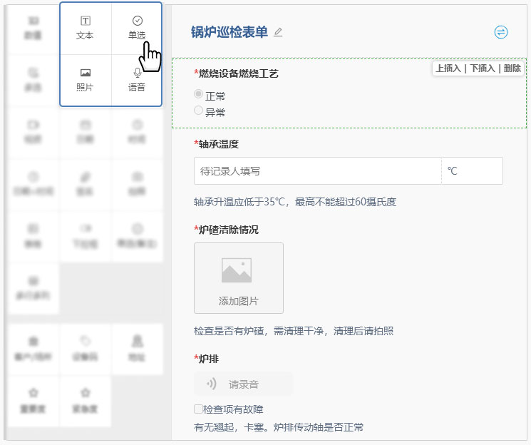 2、在巡檢表單設(shè)計中,您可以為大部分的檢查項設(shè)定合格范圍。不合格表單可以被單獨訂閱、統(tǒng)計或作為觸發(fā)工單系統(tǒng)的條件。比如:溫度值范圍,單選、多選的不合格項等等。此外,在表單設(shè)計中您還可以為巡檢項填寫檢查方法及檢查標準,供巡檢人隨時查看。