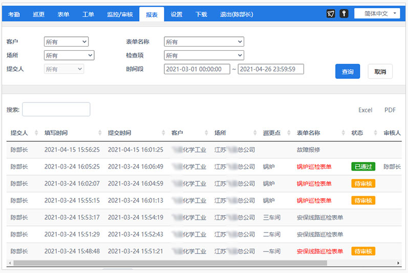 表單報表有“表單詳情報表”、“已提交表單報表”、“異常表單匯總報表”、“表單審核”報表、“異常表單監(jiān)控”報表。